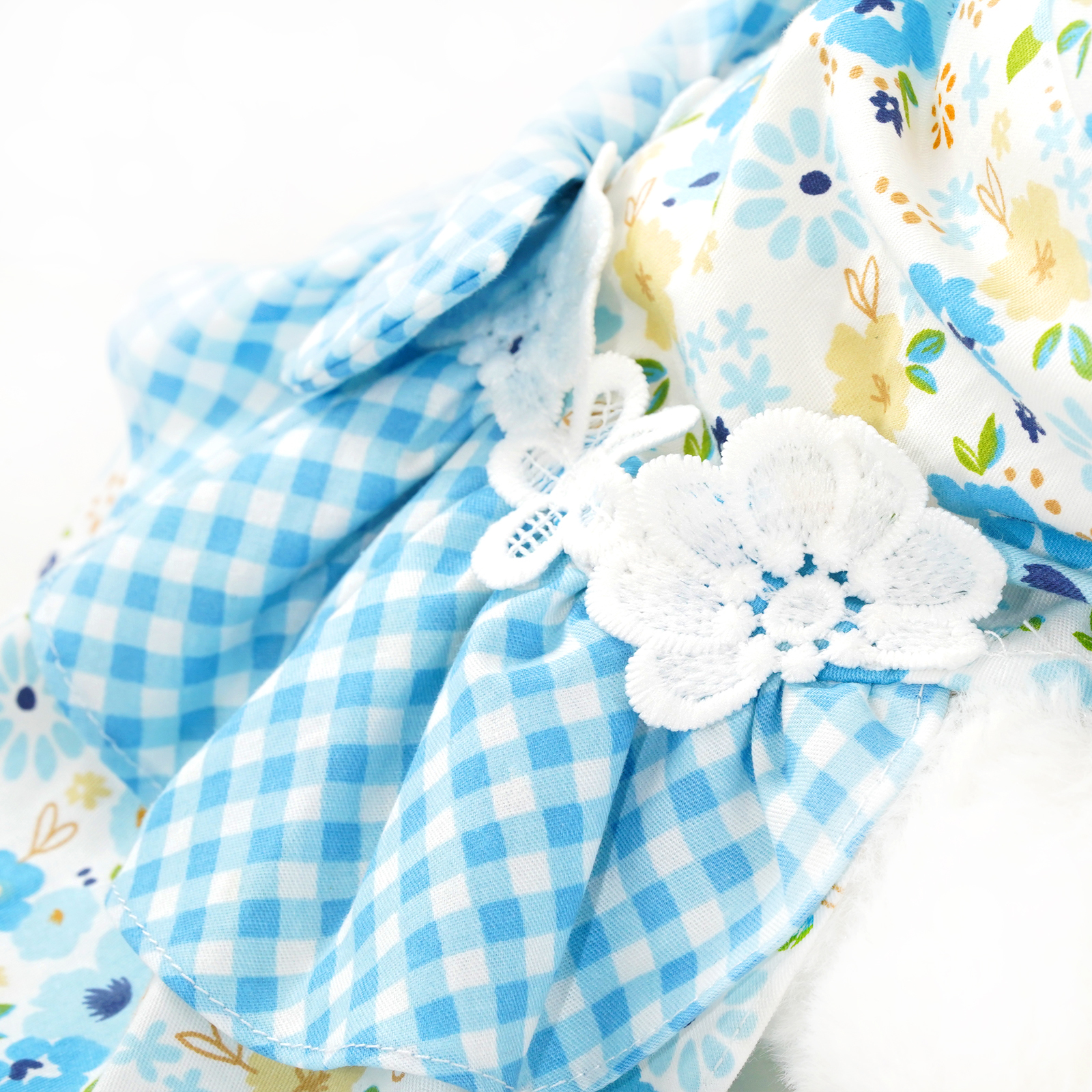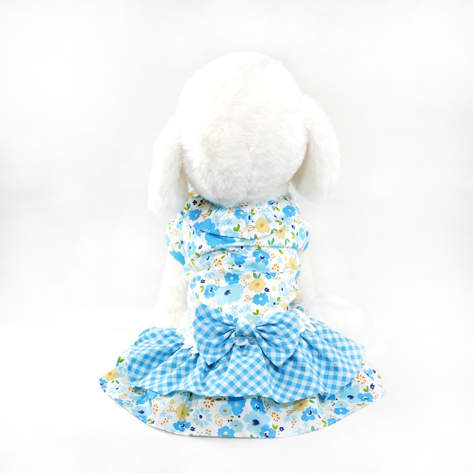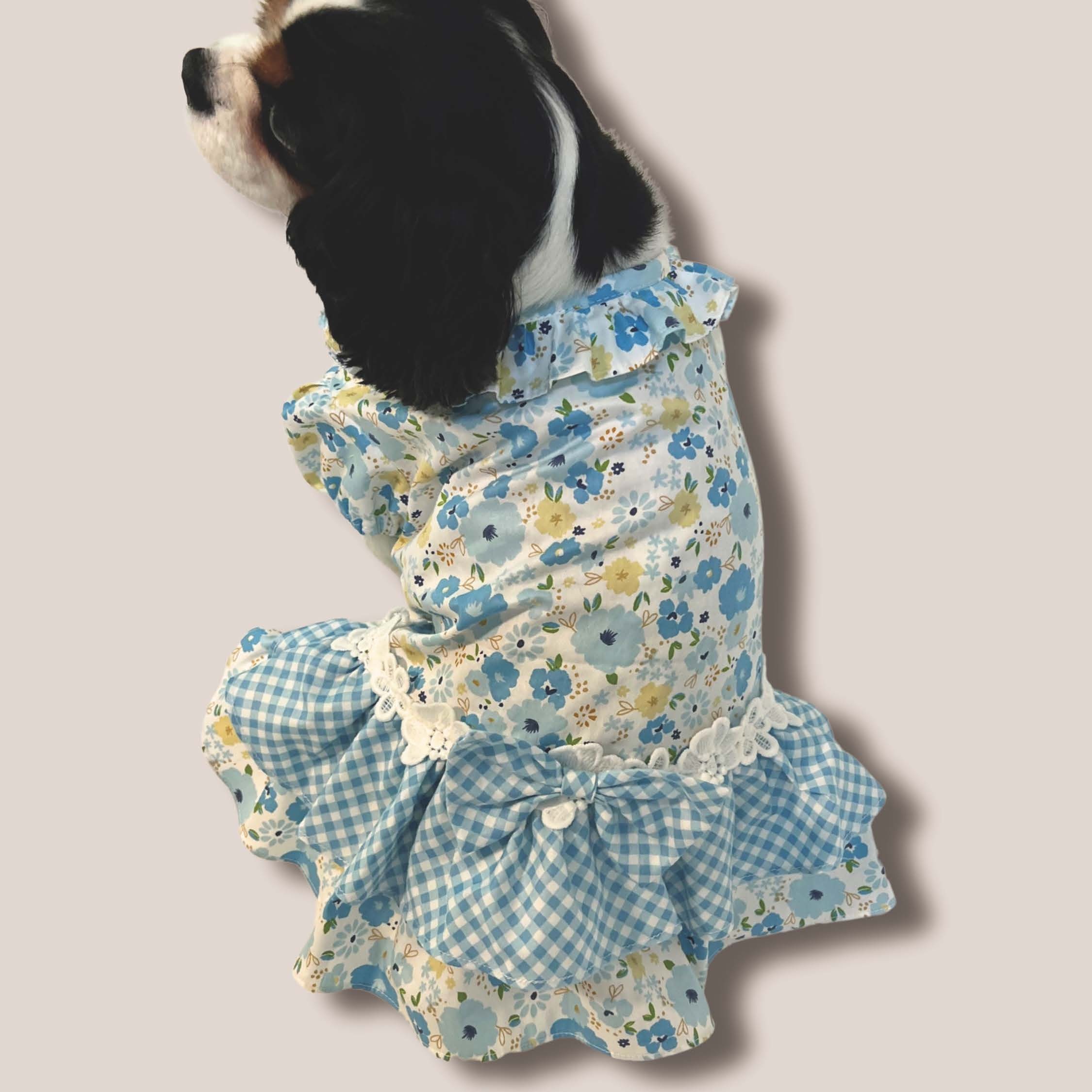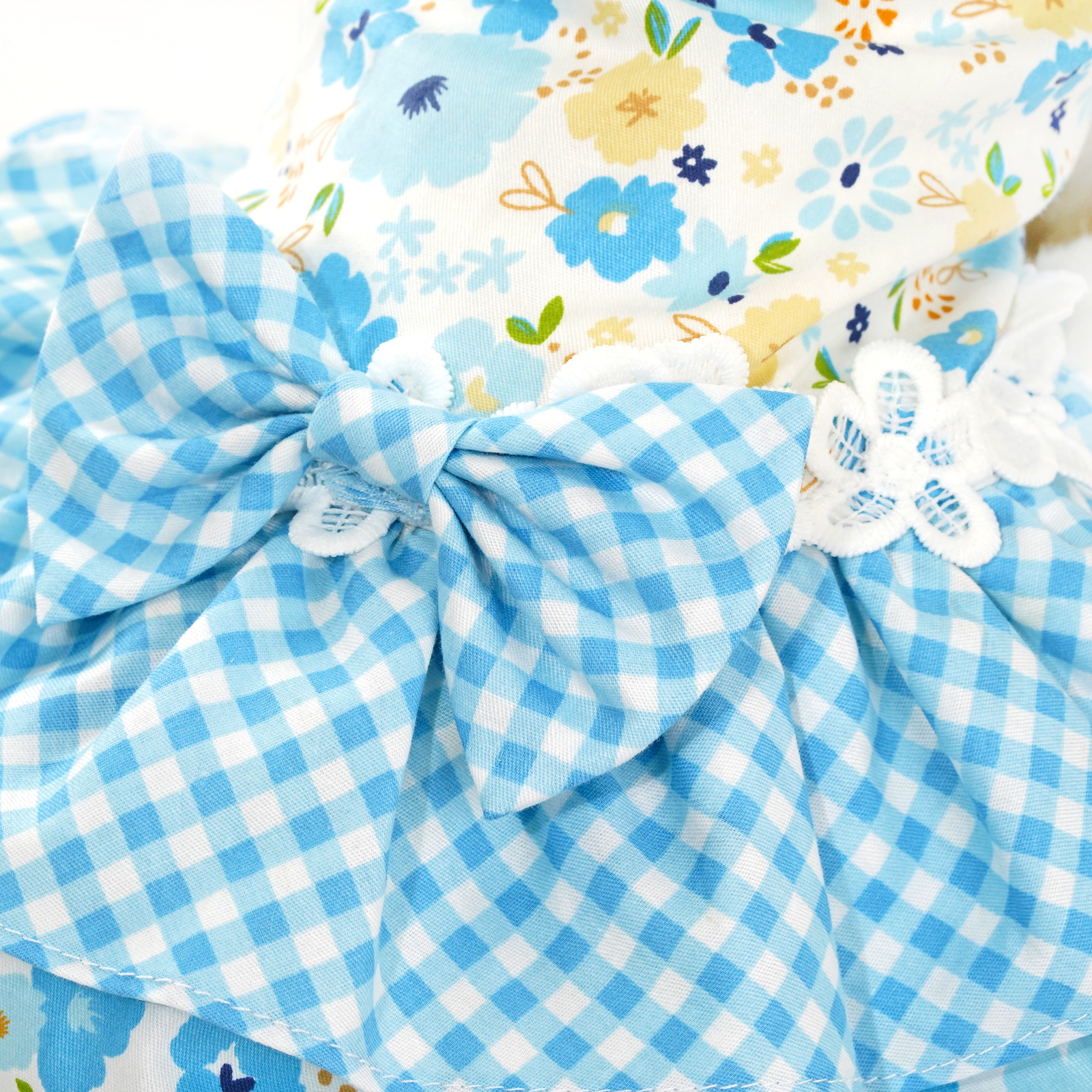 - Light blue floral pattern bodice with blue plaid pattern dress