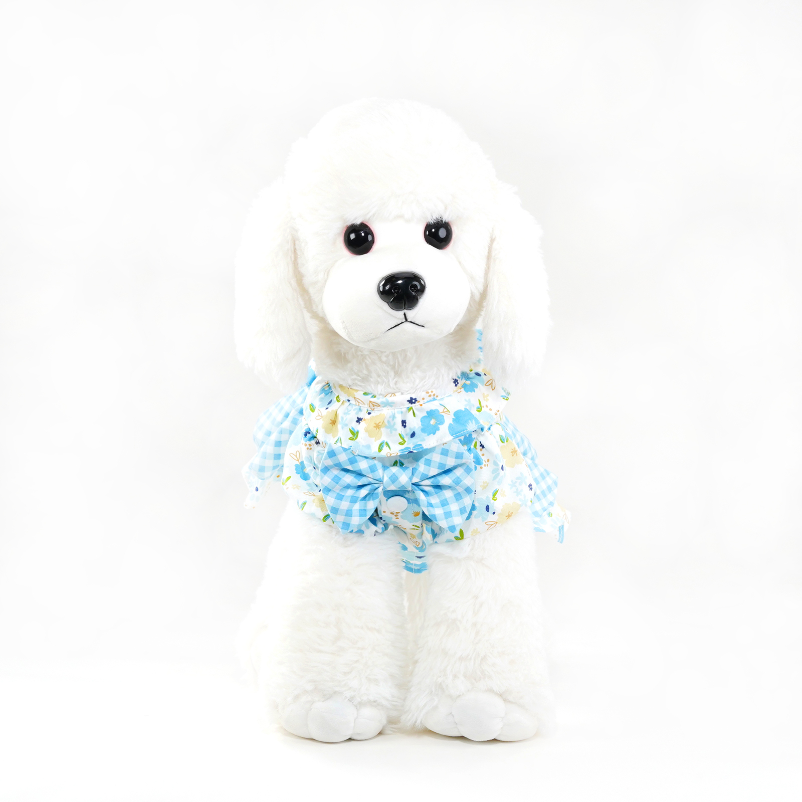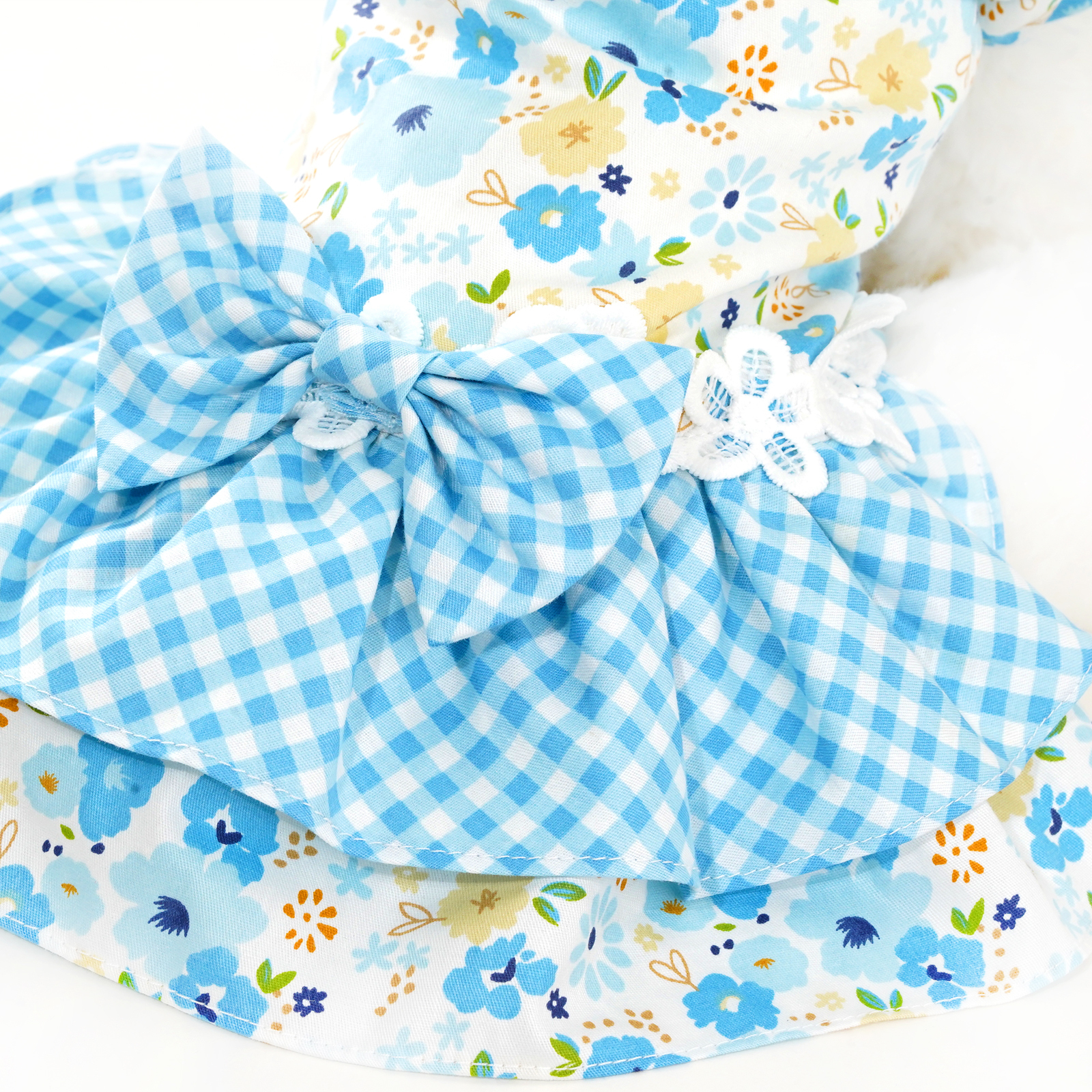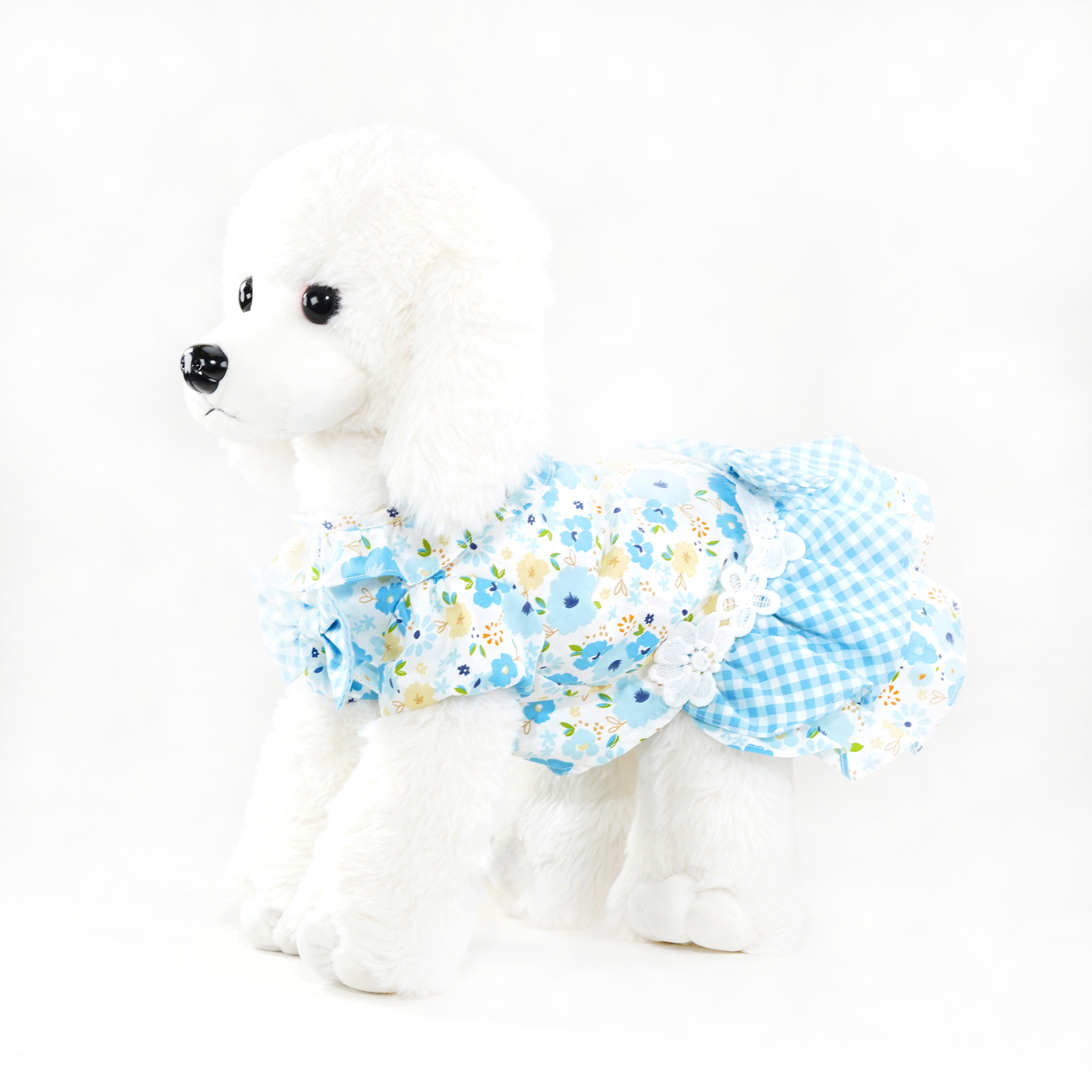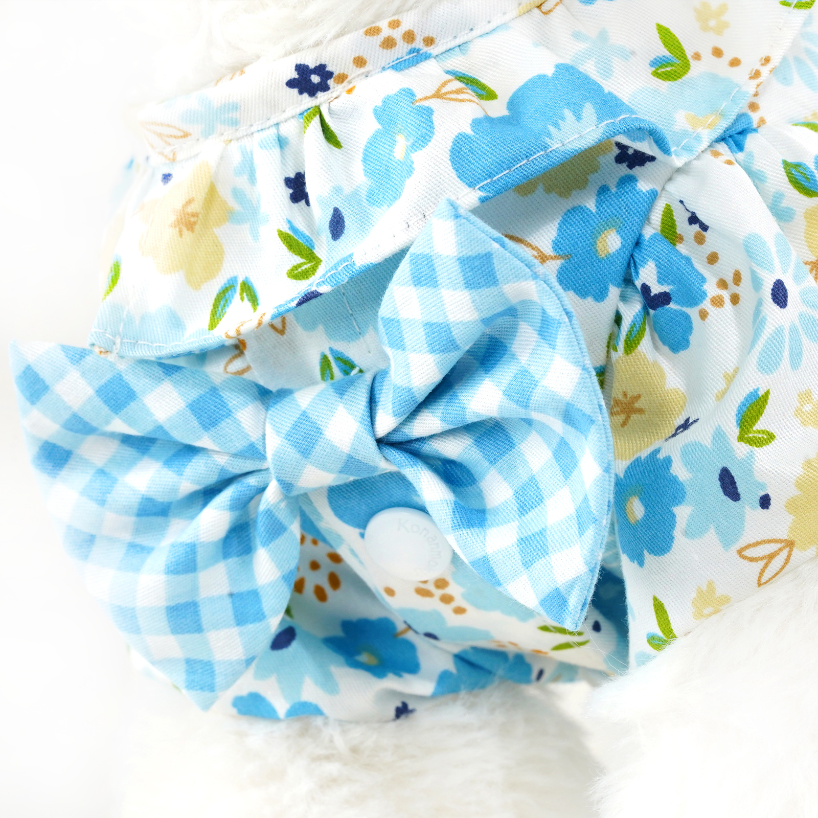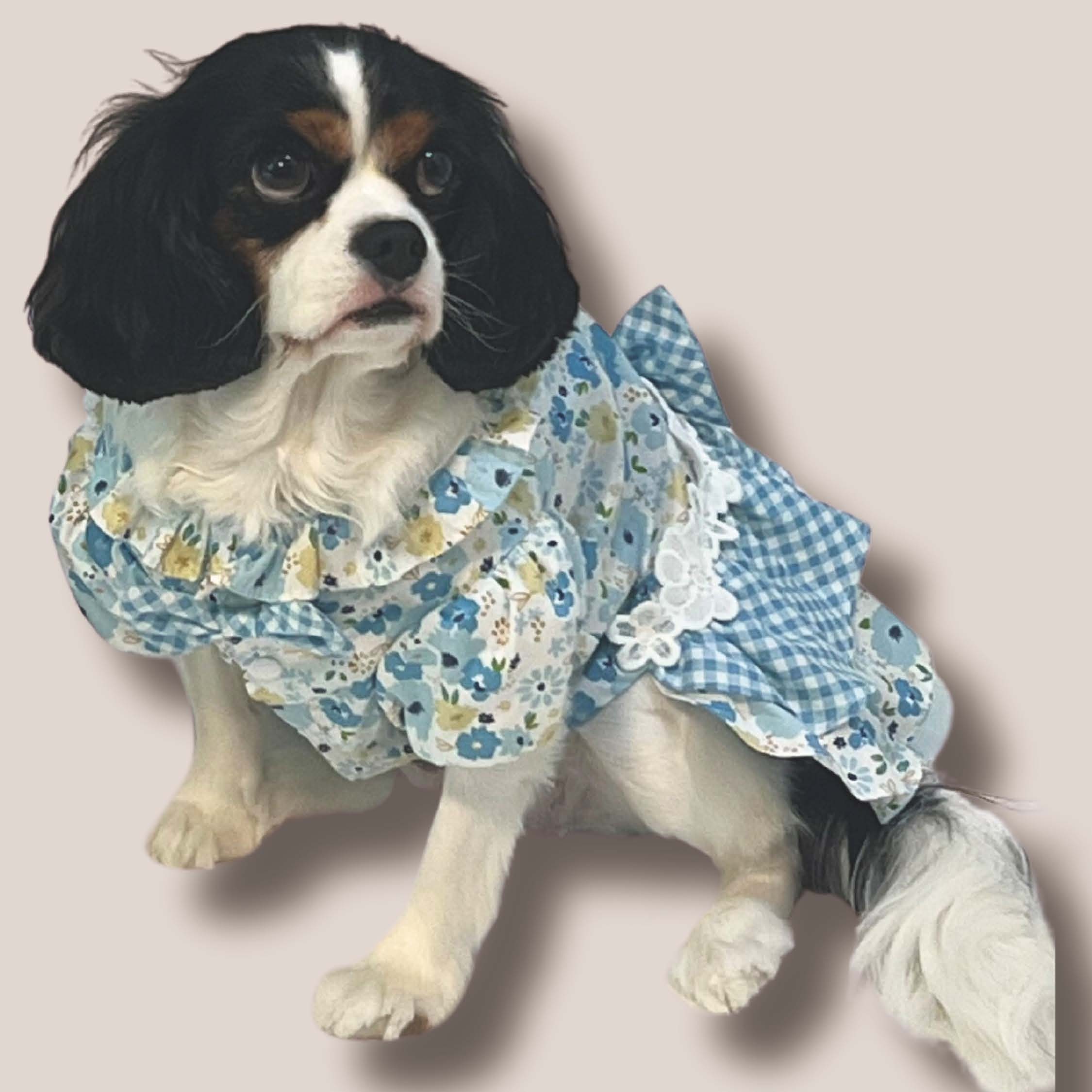- Light blue floral pattern bodice with blue plaid pattern dress
