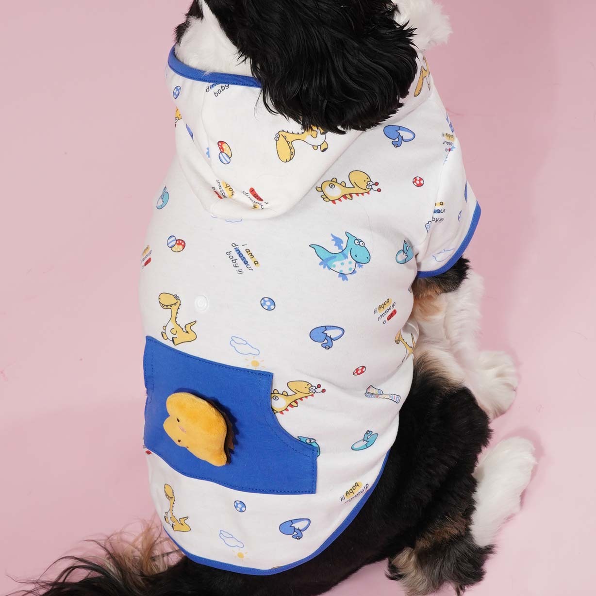 l   布料以可愛小恐龍圖案襯托,口袋外有一個可愛的小恐龍玩具公仔