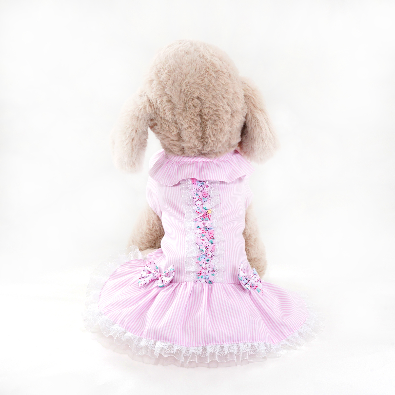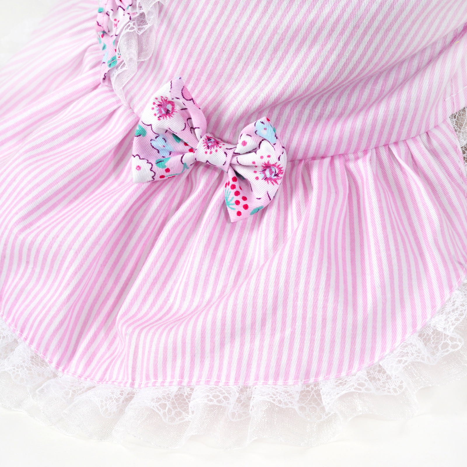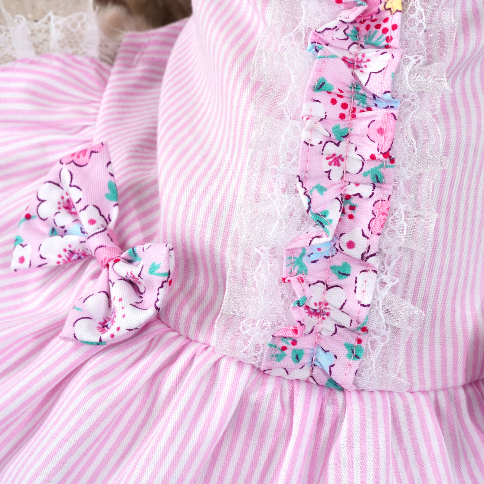 - Pink striped dress with lace and floral design
