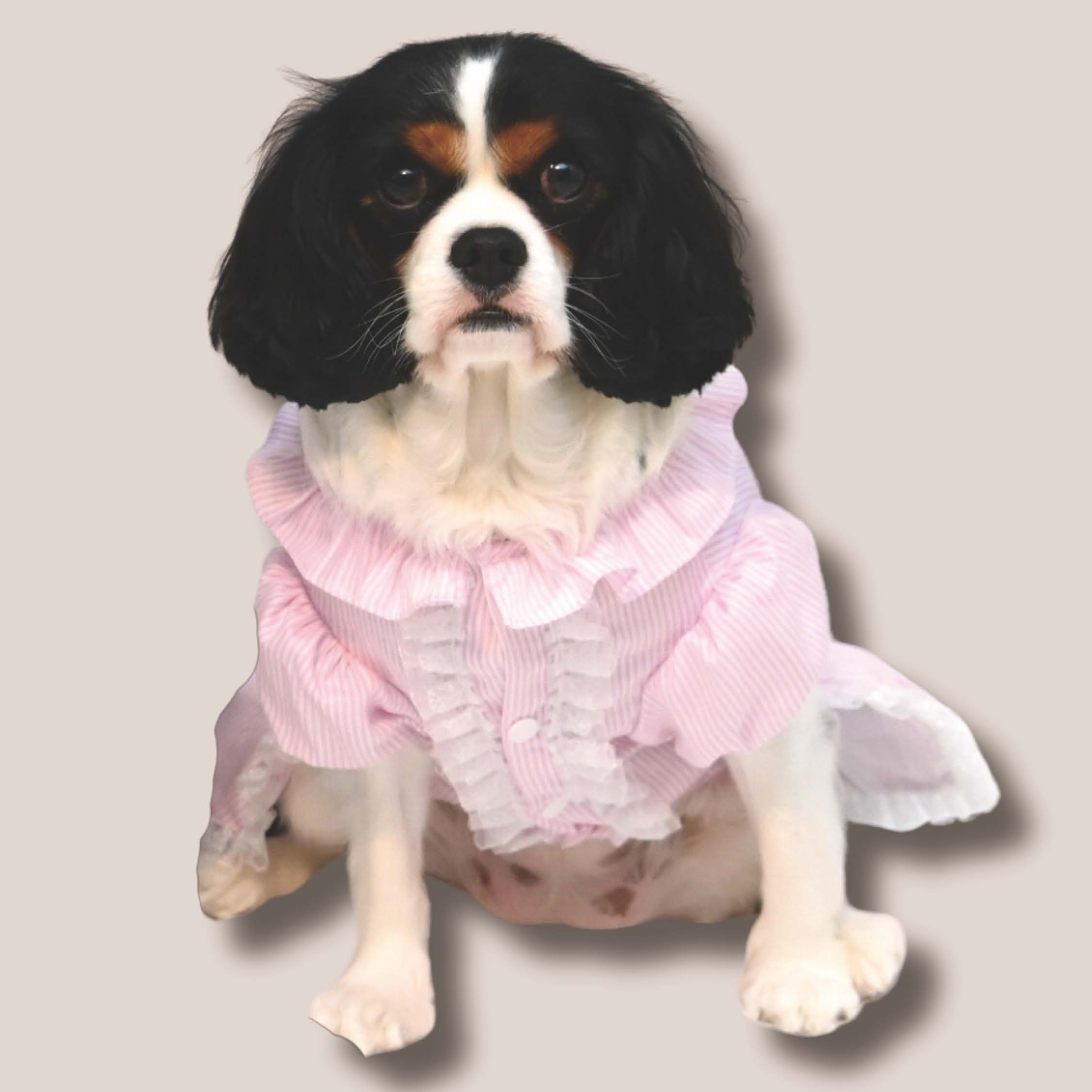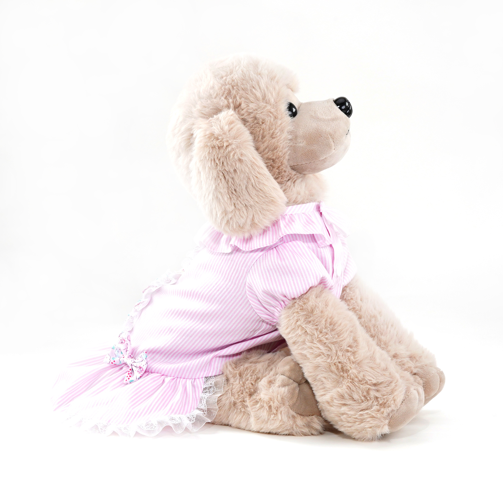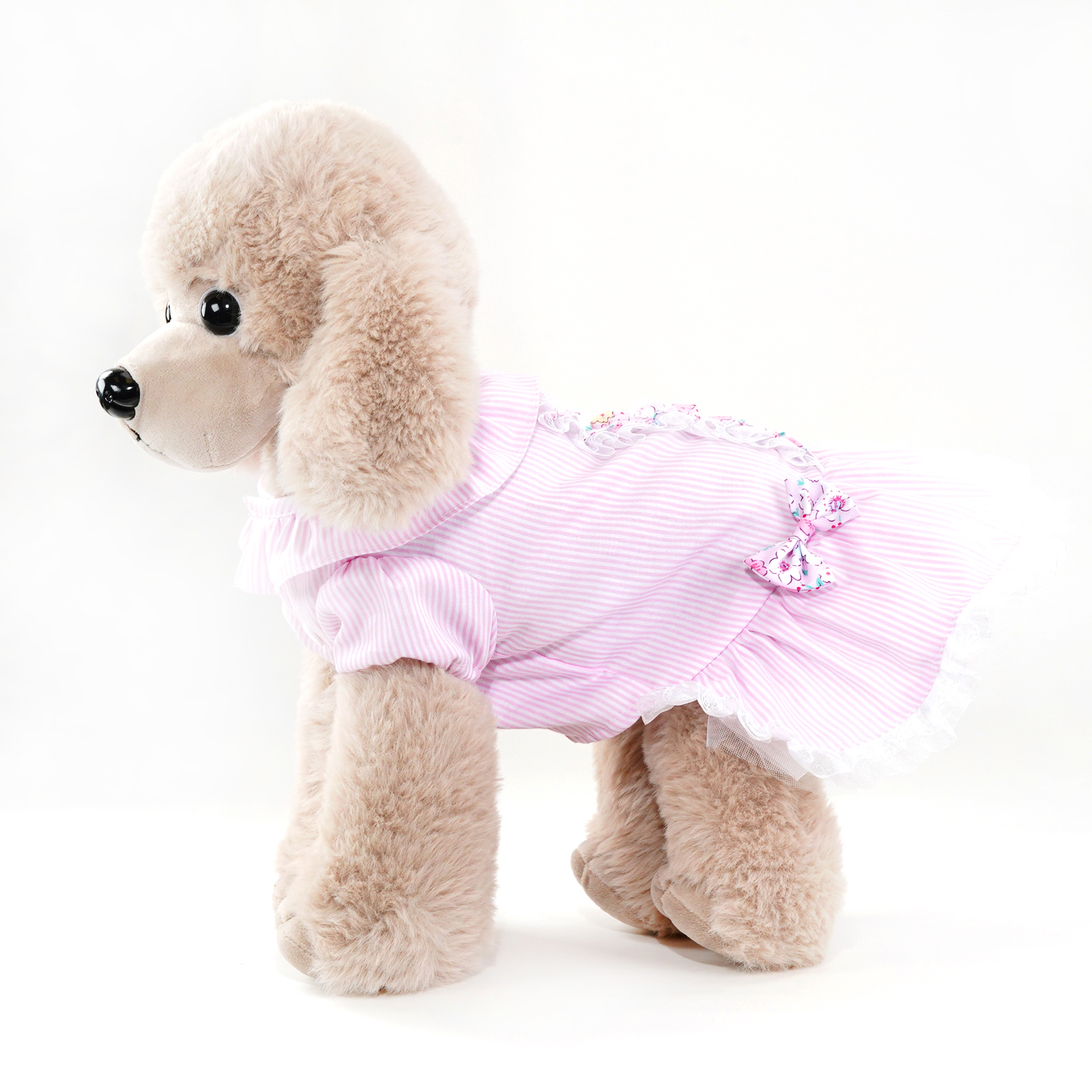 - Pink striped dress with lace and floral design